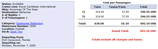 In the second example, when it is available, there are only two adults in each stateroom. By adding two of these staterooms together, the total for the two staterooms is $1386.20 or about $240 more than a single stateroom. You can decide in this example is it worth having the extra space for the additional amount you will be paying.