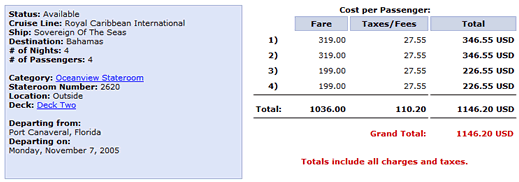 Here is how to understand the cost difference between booking a stateroom for 4, or selecting 2 separate staterooms each with 2 adults. (Staterooms are based on double occupancy) In this first example, there are 4 adults sharing this stateroom on the Royal Caribbean sailing shown below. The Total price for this sailing is $1146.20